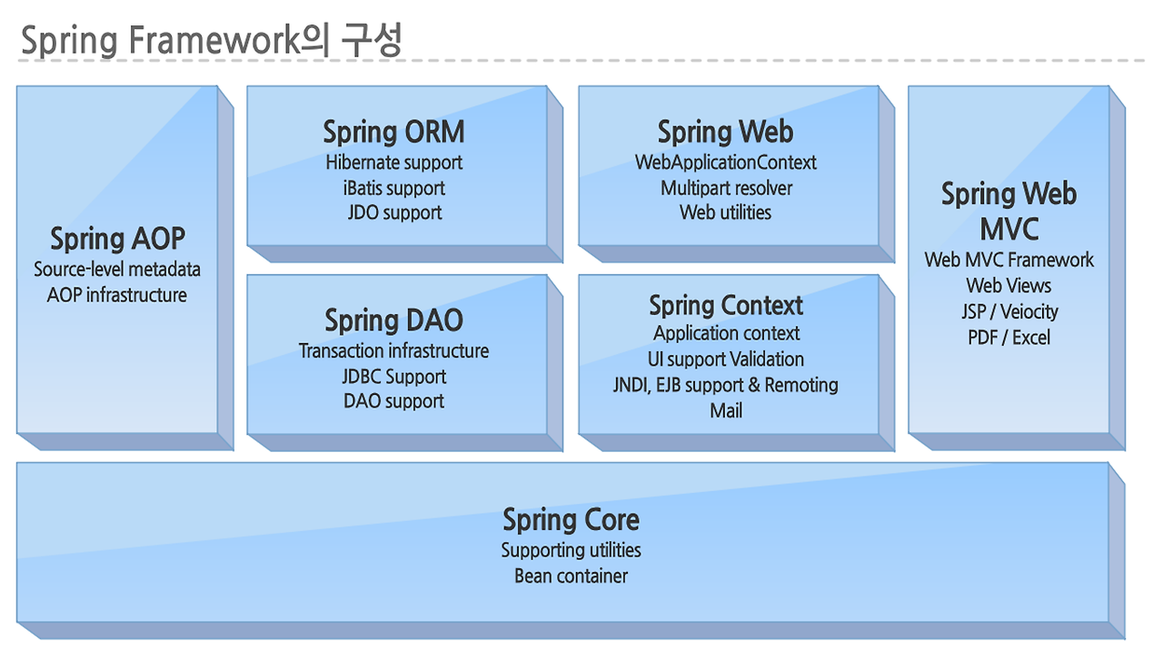 - Spring ORM : 우리는 mybatis 이용할 것임 (Hibernate support, IBatis support, JDO support)