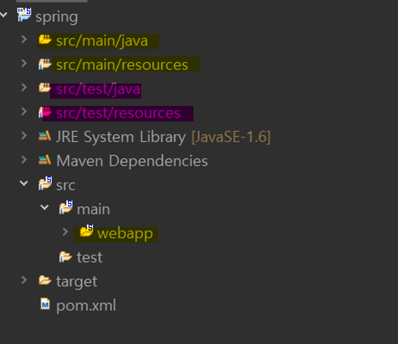 - src/test/resources : test 프로그램 만들 때 필요한 값들을 저장하는 폴더 : xml파일 , properties파일