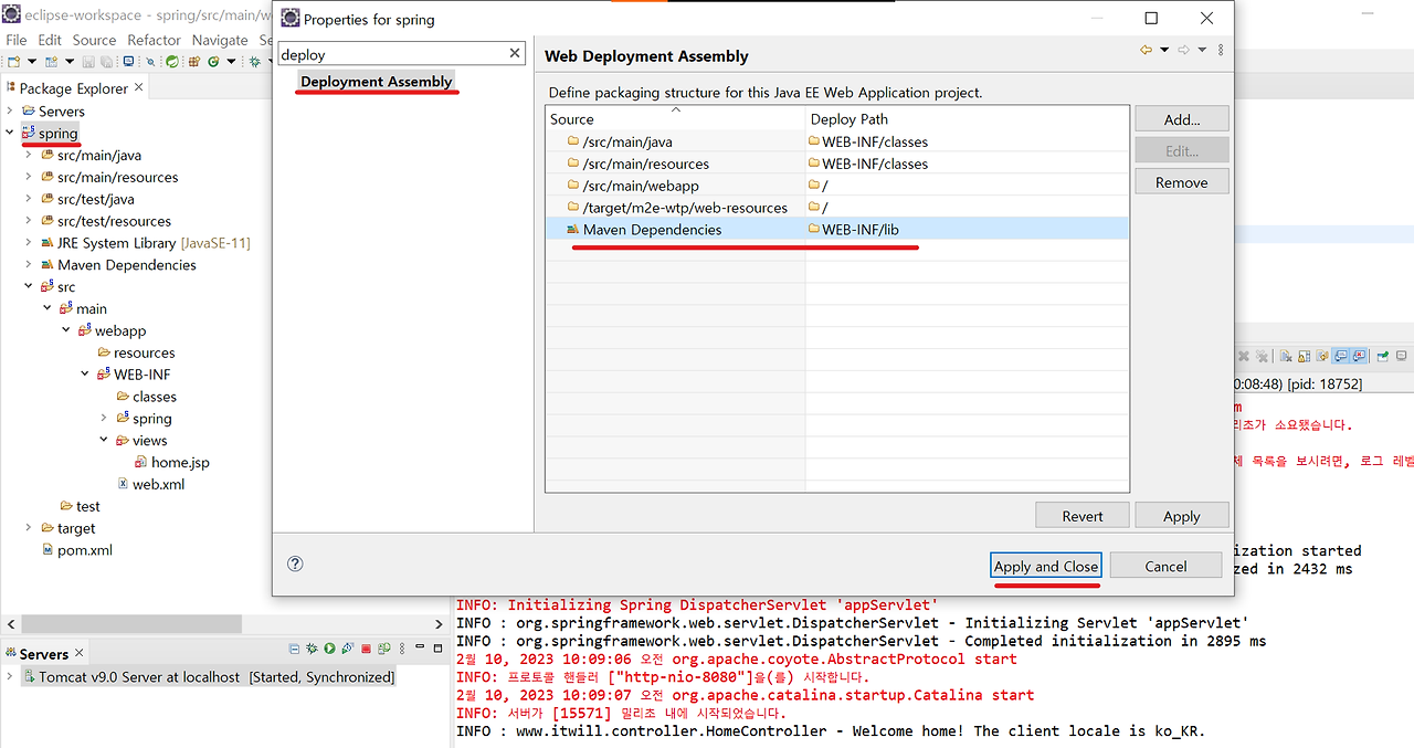 - 밑에처럼 web deloyment assembly에서 maven dependencies가 web-inf/lib있나 확인
