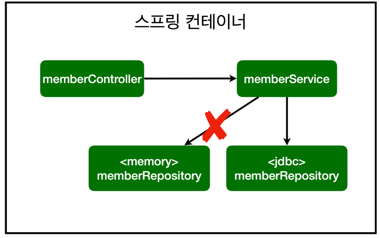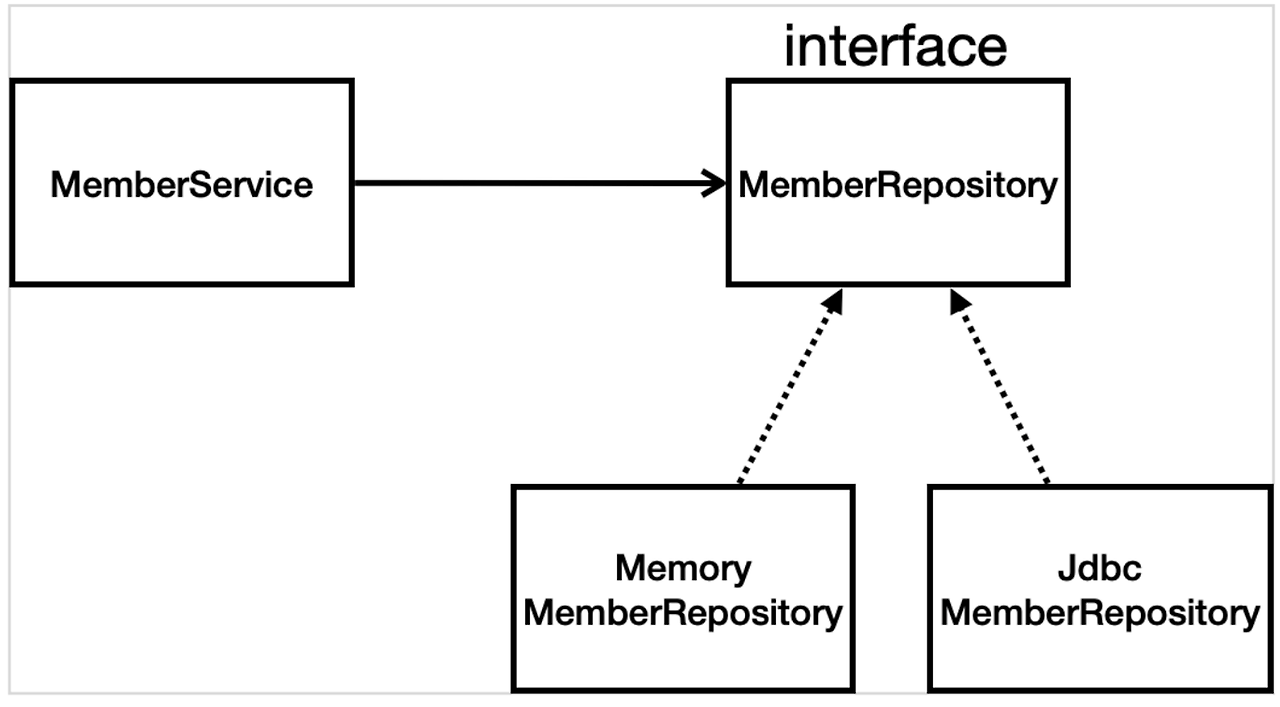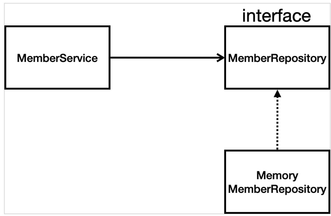 - 아직 데이터 저장소가 선정되지 않을 때 클래스 간 의존관계 및 스프링 설정 관계 (인터페이스로 구현 클래스를 변경할 수 있도록 설계 - 확장가능하도록)