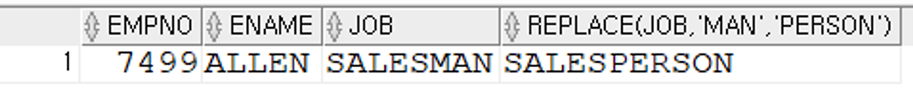 SELECT EMPNO, ENAME, JOB, REPLACE(JOB, 'MAN', 'PERSON') FROM EMP WHERE EMPNO=7499;