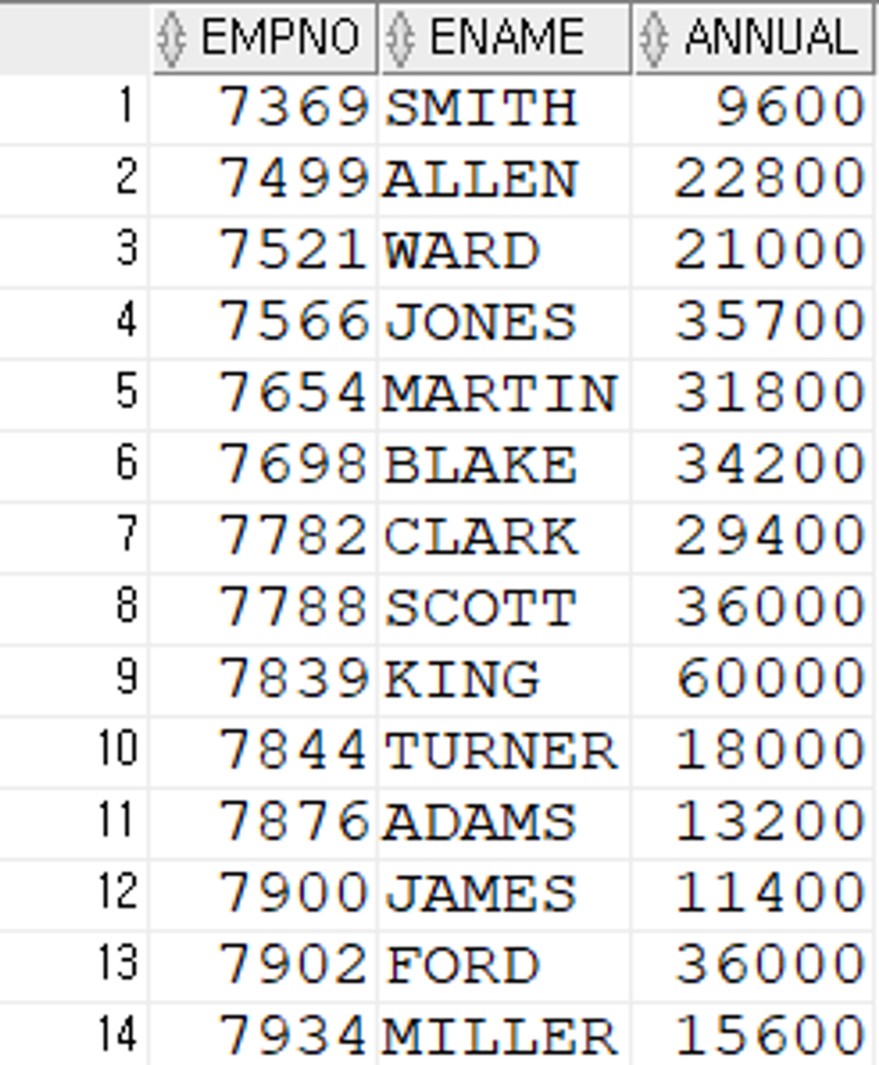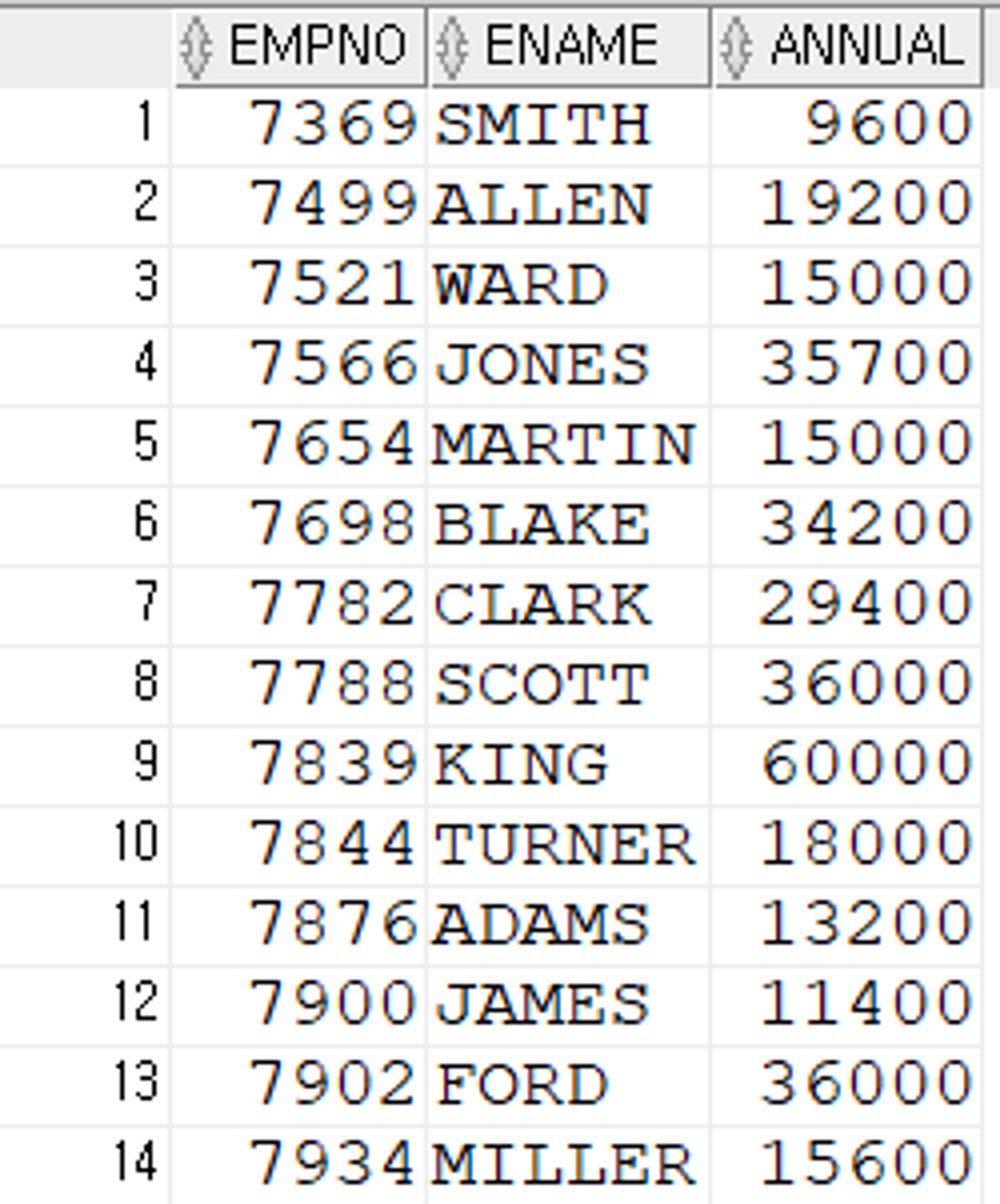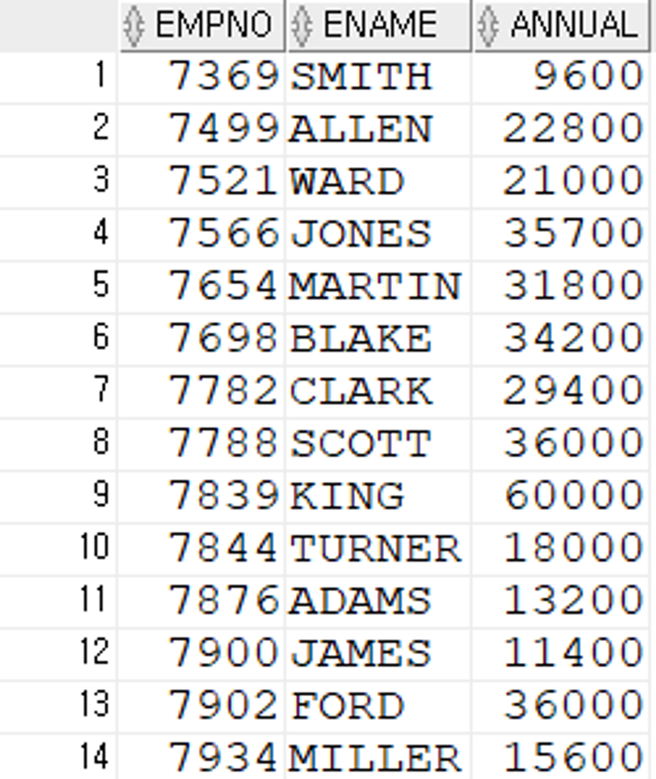 SELECT EMPNO, ENAME, SAL*12 ANNUAL FROM EMP;