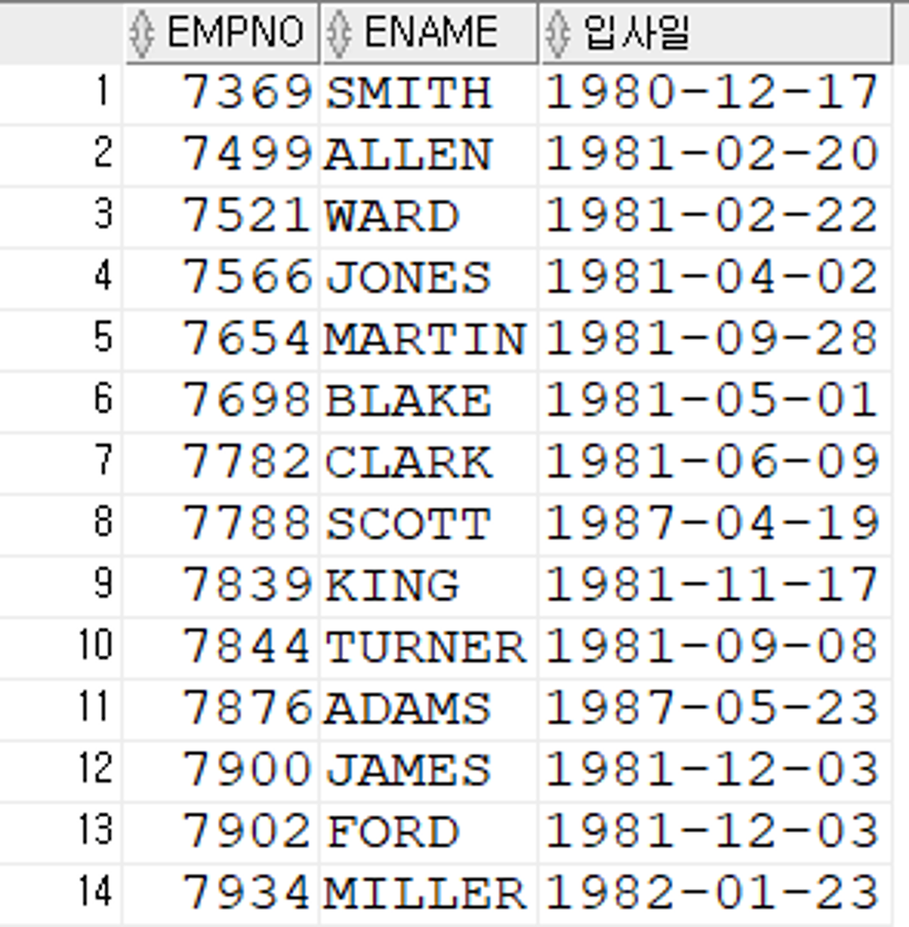SELECT EMPNO, ENAME, TO_CHAR(HIREDATE,'YYYY-MM-DD') "입사일" FROM EMP;