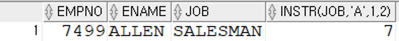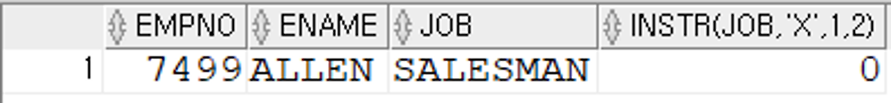 SELECT EMPNO, ENAME, JOB, INSTR(JOB,'X',1,2) FROM EMP WHERE EMPNO=7499; -- 검색문자값이 없는 경우 0 반환