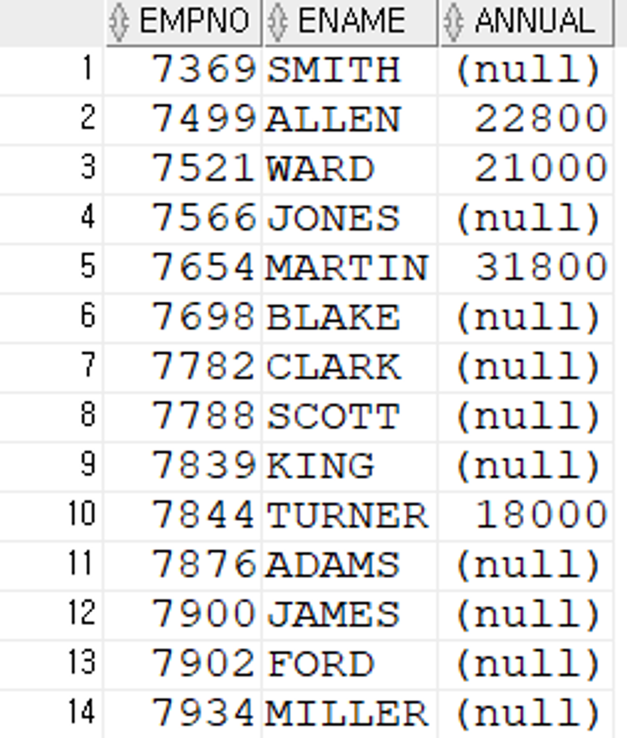 SELECT EMPNO, ENAME, (SAL+NVL(COMM,0))*12 ANNUAL FROM EMP; --검색성공