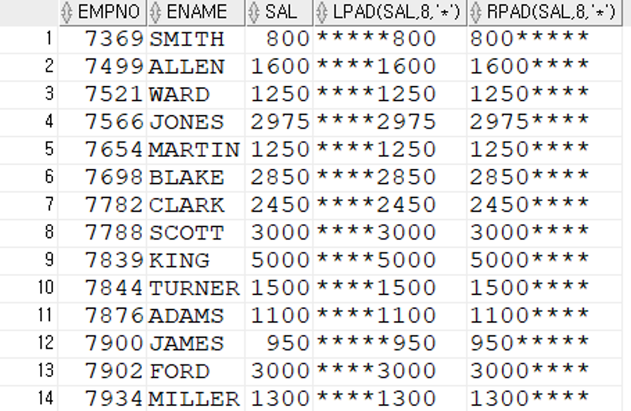 SELECT EMPNO, ENAME, SAL, LPAD(SAL,8,'*'), RPAD(SAL,8,'*') FROM EMP;
