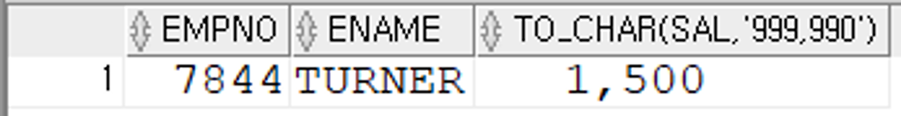 SELECT EMPNO, ENAME, TO_CHAR(SAL,'999,990') FROM EMP WHERE EMPNO=7844;