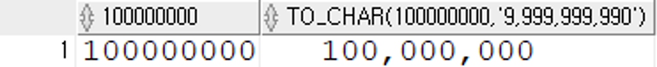 SELECT 100000000, TO_CHAR(100000000,'9,999,999,990') FROM DUAL; --세자리마다 콤마찍어주세요 (1억)