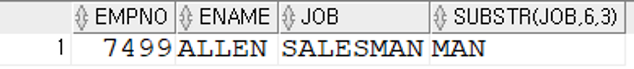 SELECT EMPNO, ENAME, JOB, SUBSTR(JOB,6,3) FROM EMP WHERE EMPNO=7499;