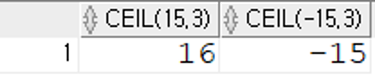 SELECT CEIL(15.3),CEIL(-15.3) FROM DUAL;