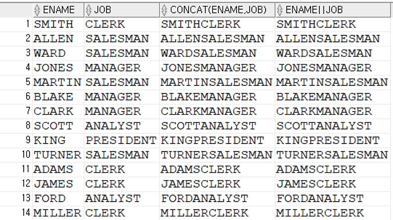 SELECT ENAME , JOB, CONCAT(ENAME,JOB), ENAME||JOB FROM EMP;