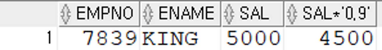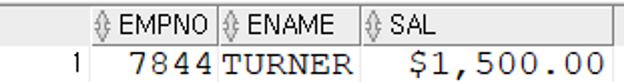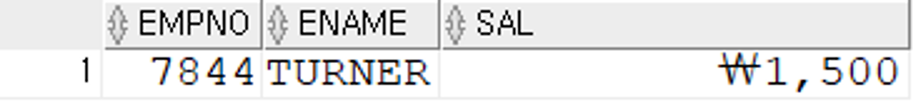 SELECT EMPNO, ENAME, TO_CHAR(SAL,'L999,990') SAL FROM EMP WHERE EMPNO=7844;