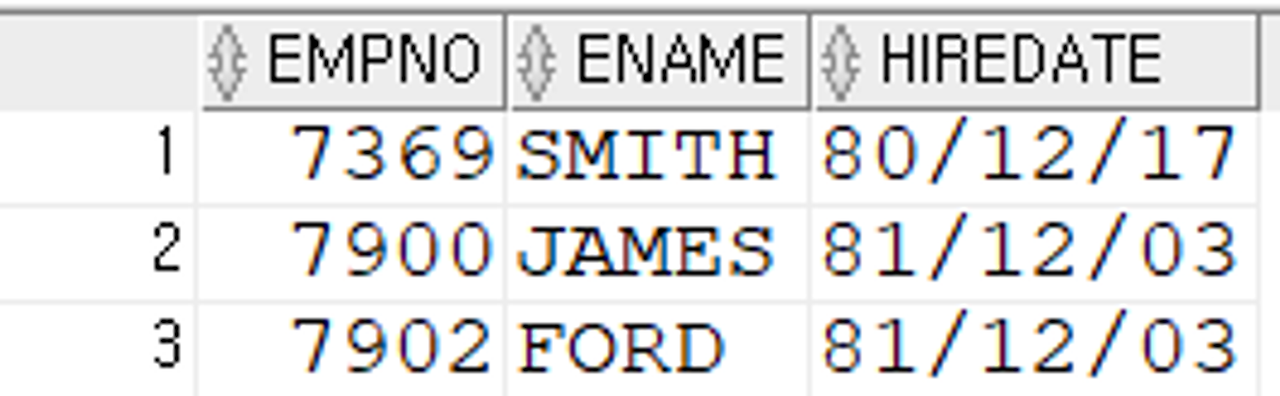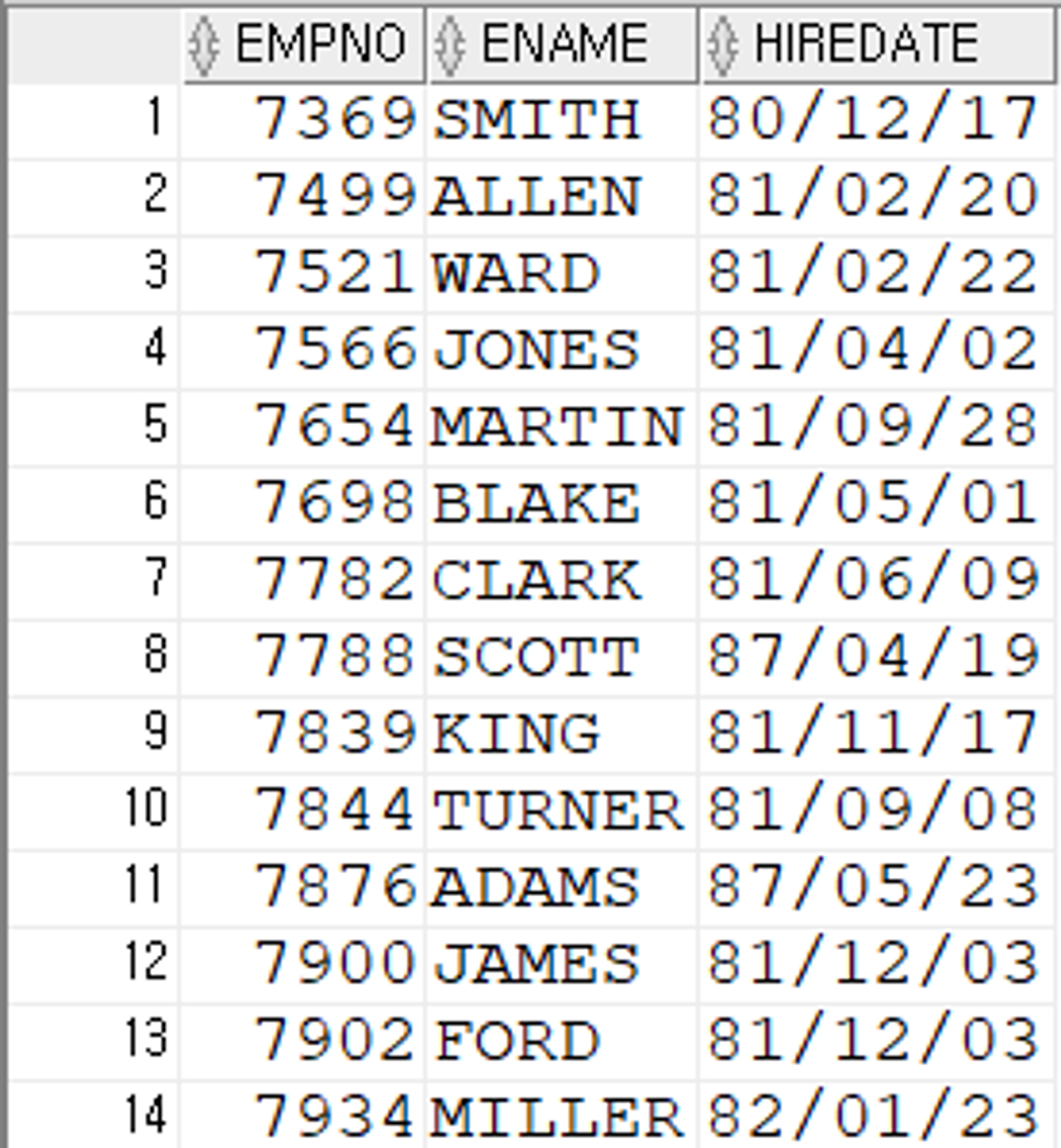 SELECT EMPNO, ENAME, HIREDATE FROM EMP;