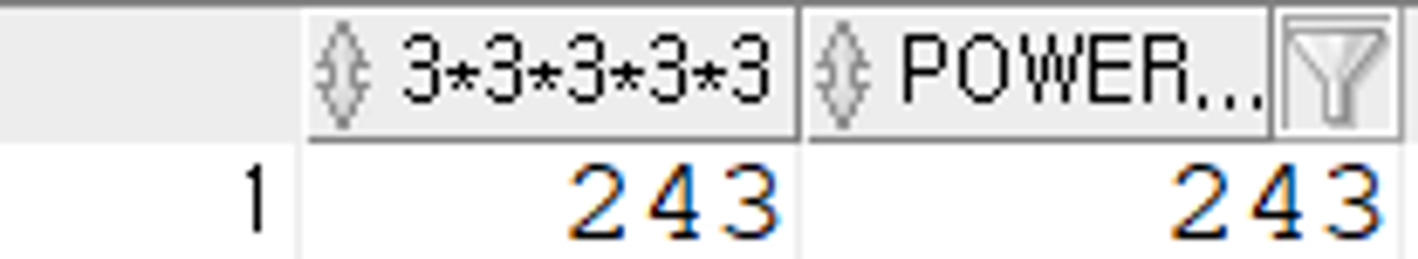 SELECT 3*3*3*3*3,POWER(3,5) FROM DUAL;