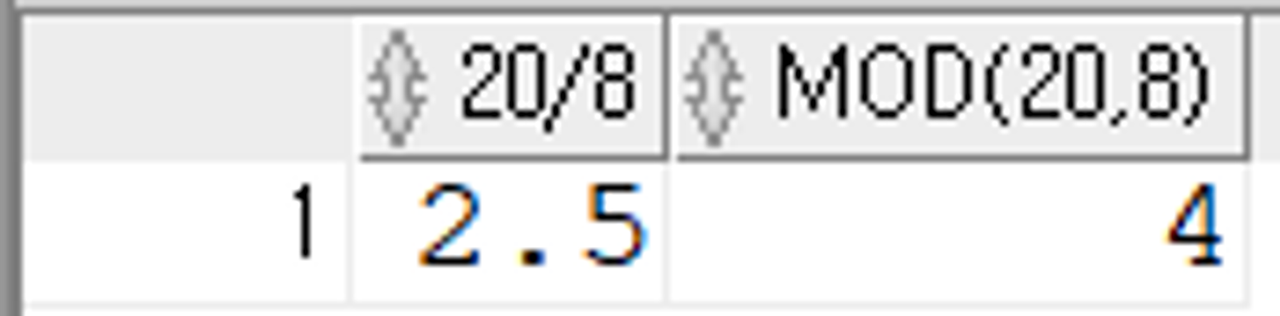 SELECT 20/8, MOD(20,8) FROM DUAL;