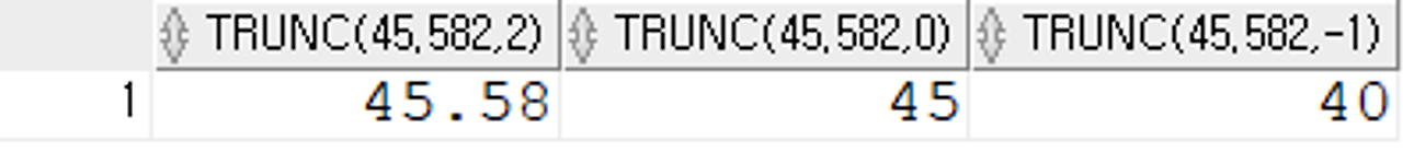 SELECT TRUNC(45.582,2),TRUNC(45.582,0),TRUNC(45.582,-1) FROM DUAL;