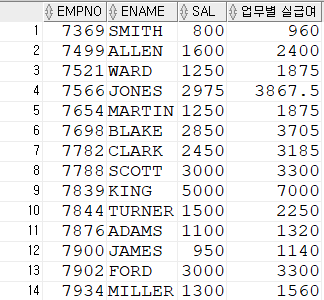 --ANALYST:급여*1.1, CLERCK :급여*1.2, MANAGER:급여*1.3, PRESIDENT:급여*1.4, SALESMAN:급여*1.5