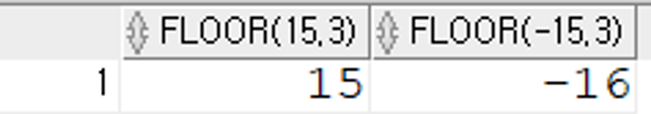 SELECT FLOOR(15.3),FLOOR(-15.3) FROM DUAL;