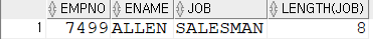 SELECT EMPNO, ENAME, JOB, LENGTH(JOB) FROM EMP WHERE EMPNO=7499;