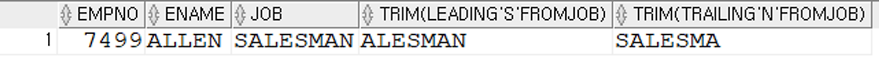SELECT EMPNO, ENAME, JOB, TRIM(LEADING 'S' FROM JOB), TRIM(TRAILING 'N' FROM JOB) FROM EMP WHERE EMPNO=7499;