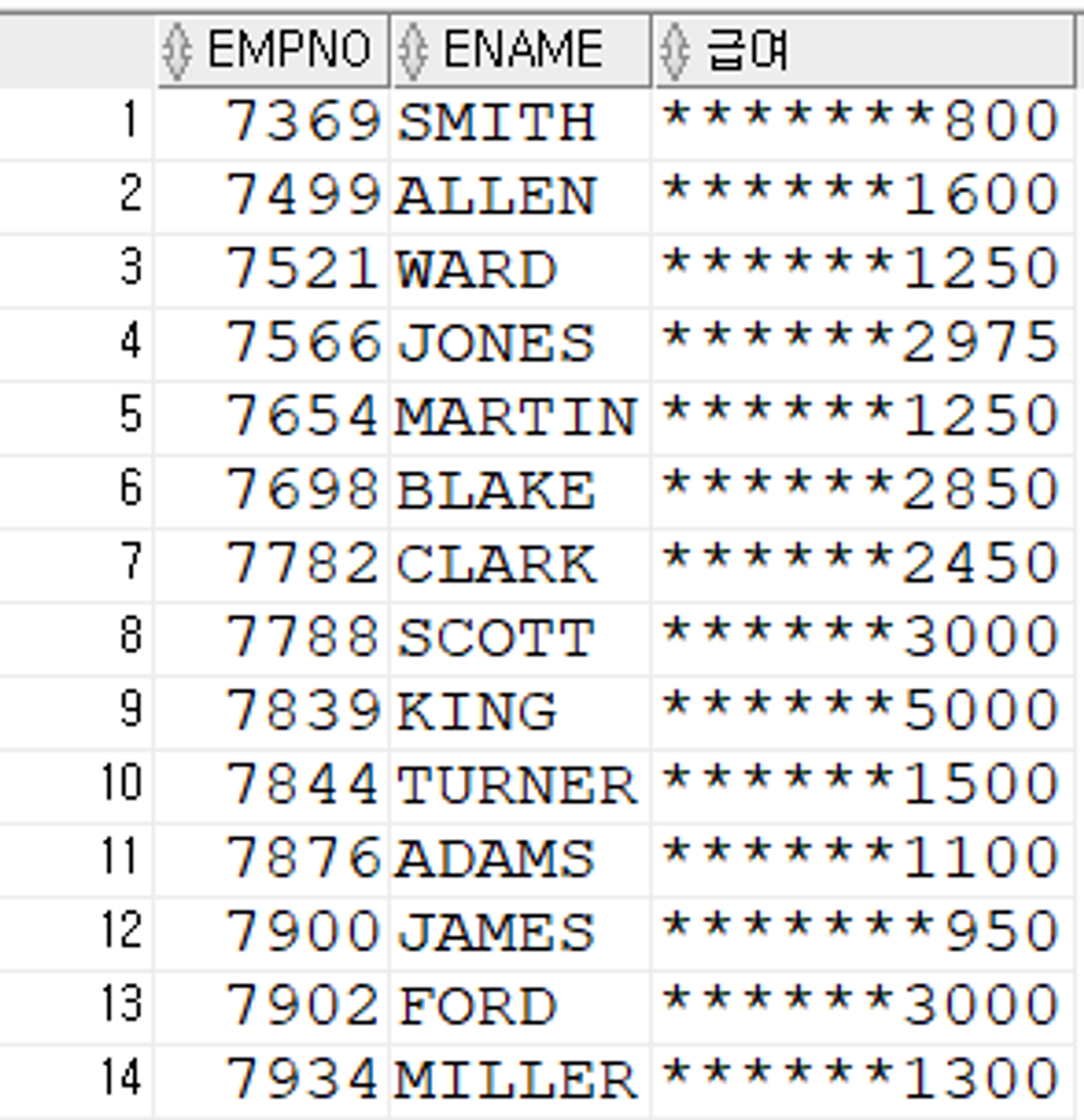 SELECT EMPNO, ENAME, LPAD(SAL,10,'*') "급여" FROM EMP;