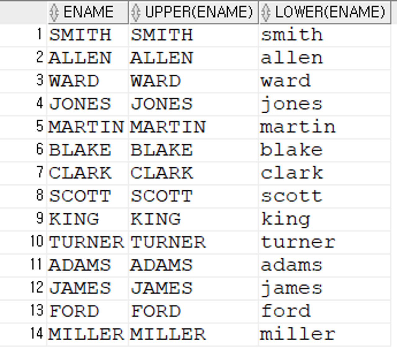 SELECT ENAME, UPPER(ENAME), LOWER(ENAME) FROM EMP;
