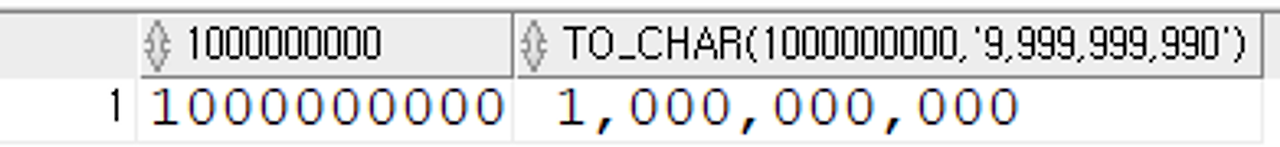SELECT 1000000000, TO_CHAR(1000000000,'9,999,999,990') FROM DUAL; --세자리마다 콤마찍어주세요 (10억)