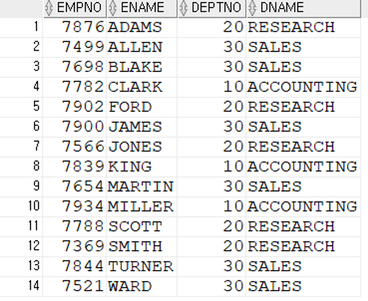-- EMP.DEPTNO이든 DEPT.DEPTNO이든 이름은 DEPTNO로 검색됨