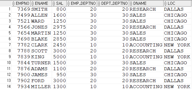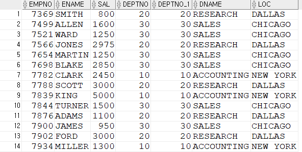 SELECT EMPNO, ENAME, SAL, EMP.DEPTNO "EMP_DEPTNO", DEPT.DEPTNO "DEPT_DEPTNO", DNAME, LOCFROM EMP, DEPT WHERE EMP.DEPTNO = DEPT.DEPTNO;