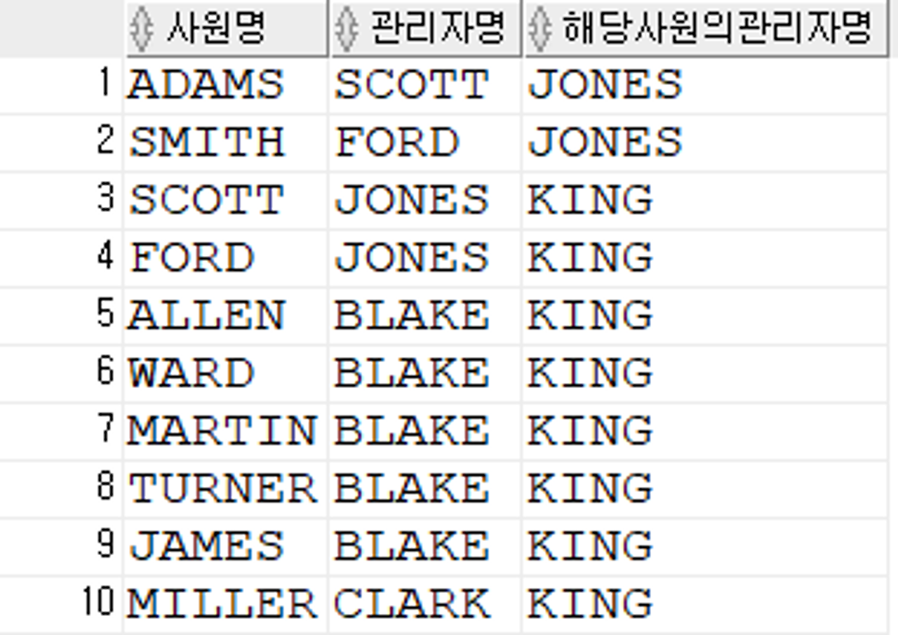 LEFT OUTER JOIN EMP KINGMANAGER ON MANAGER.MGR=KINGMANAGER.EMPNO; --결합조건2