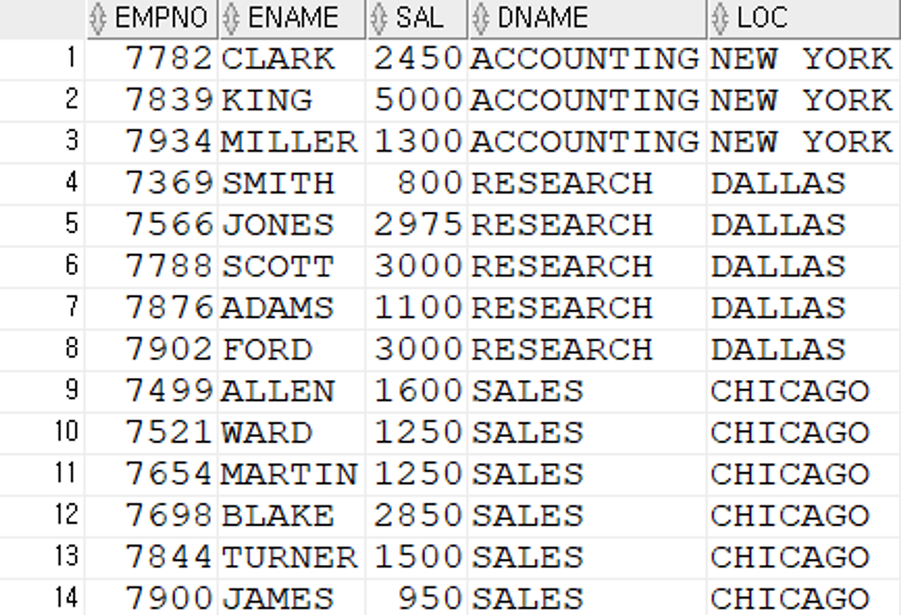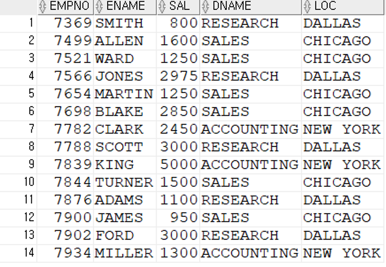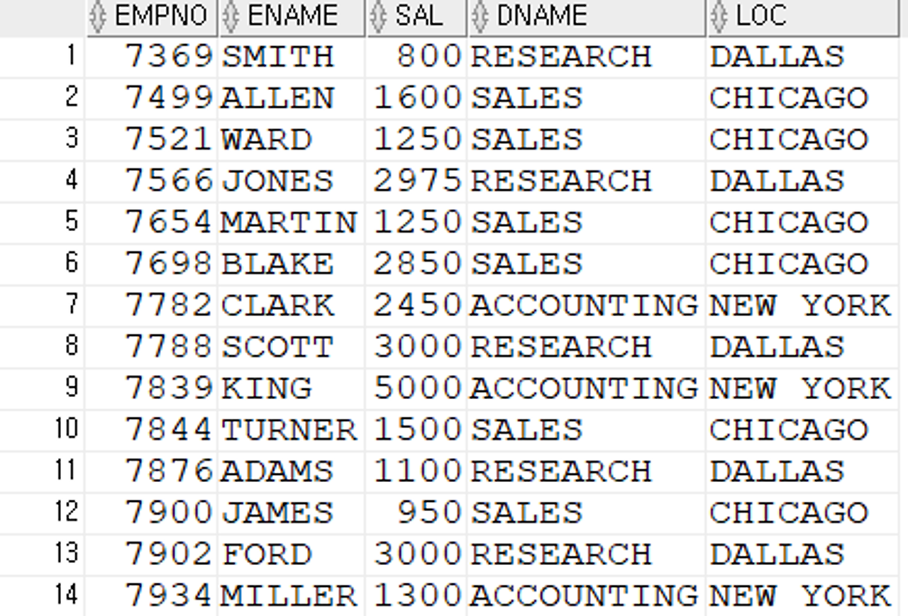 SELECT EMPNO, ENAME, SAL, DNAME, LOC FROM EMP