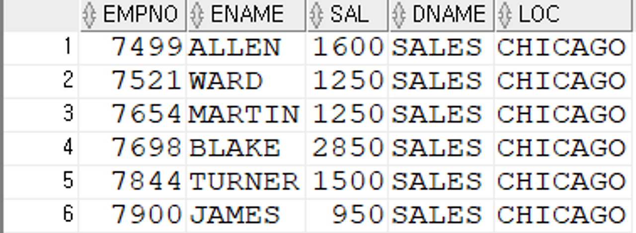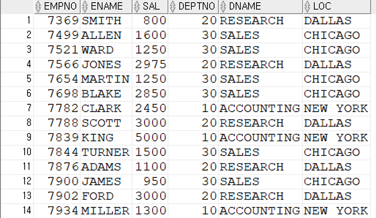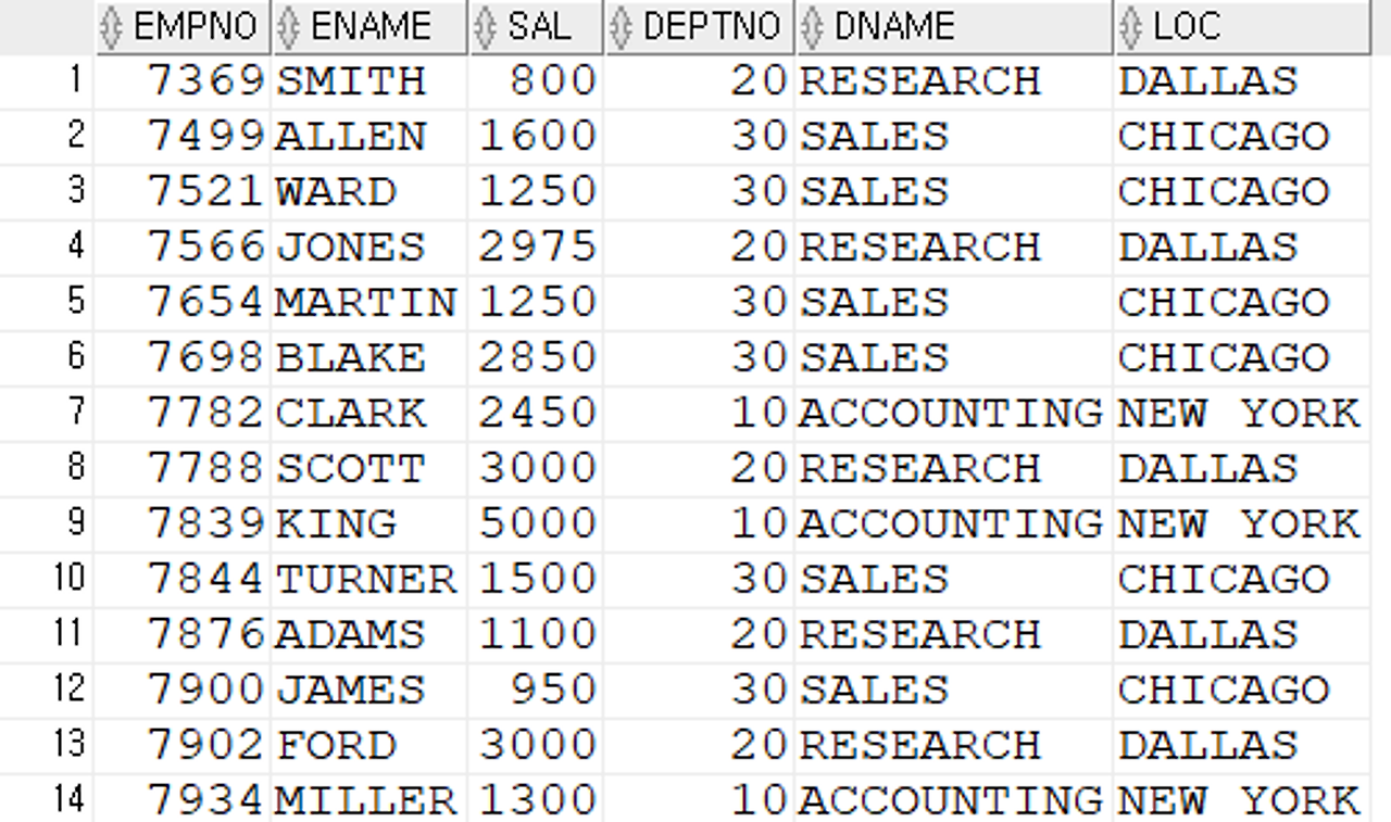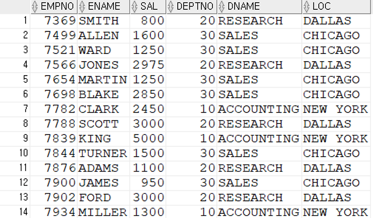 SELECT EMPNO, ENAME, SAL, DNAME, LOC FROM EMP