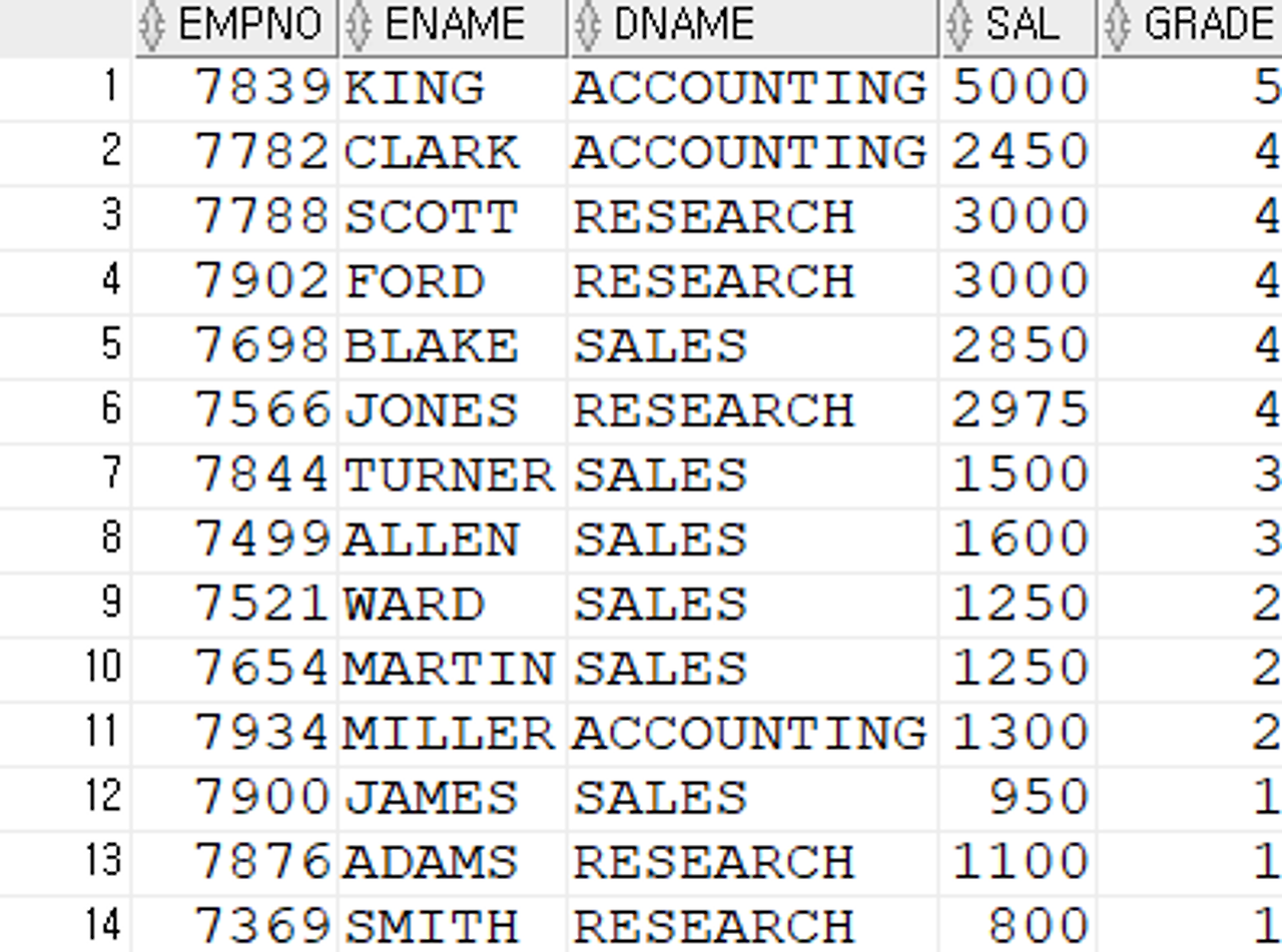 SELECT EMP.EMPNO, ENAME, DNAME, SAL, GRADE FROM EMP