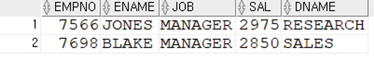 WHERE JOB='MANAGER' AND SAL>= 2500 ORDER BY EMPNO; --검색조건