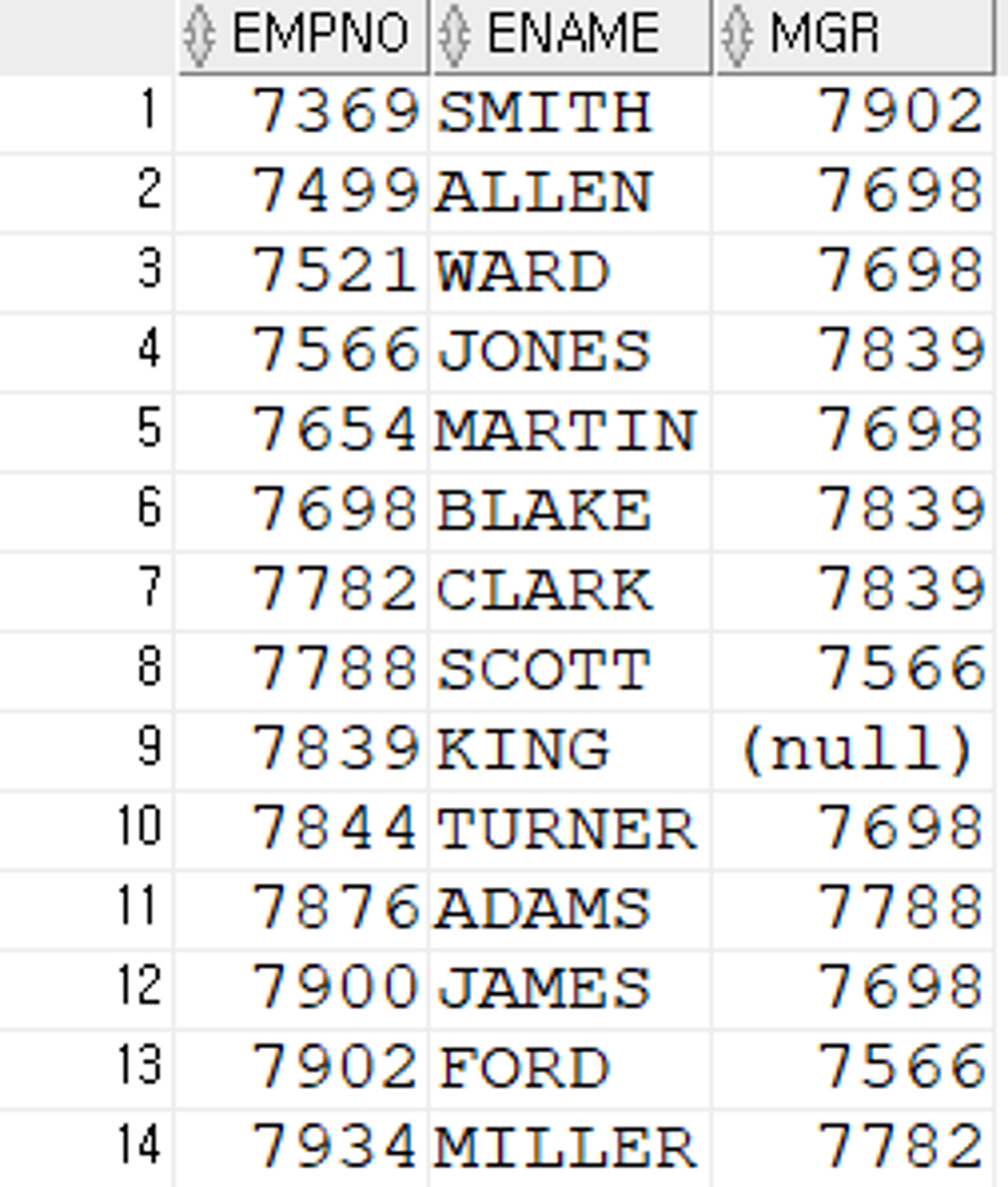 FROM EMP WORKER LEFT OUTER JOIN EMP MANAGER ON WORKER.MGR = MANAGER.EMPNO;