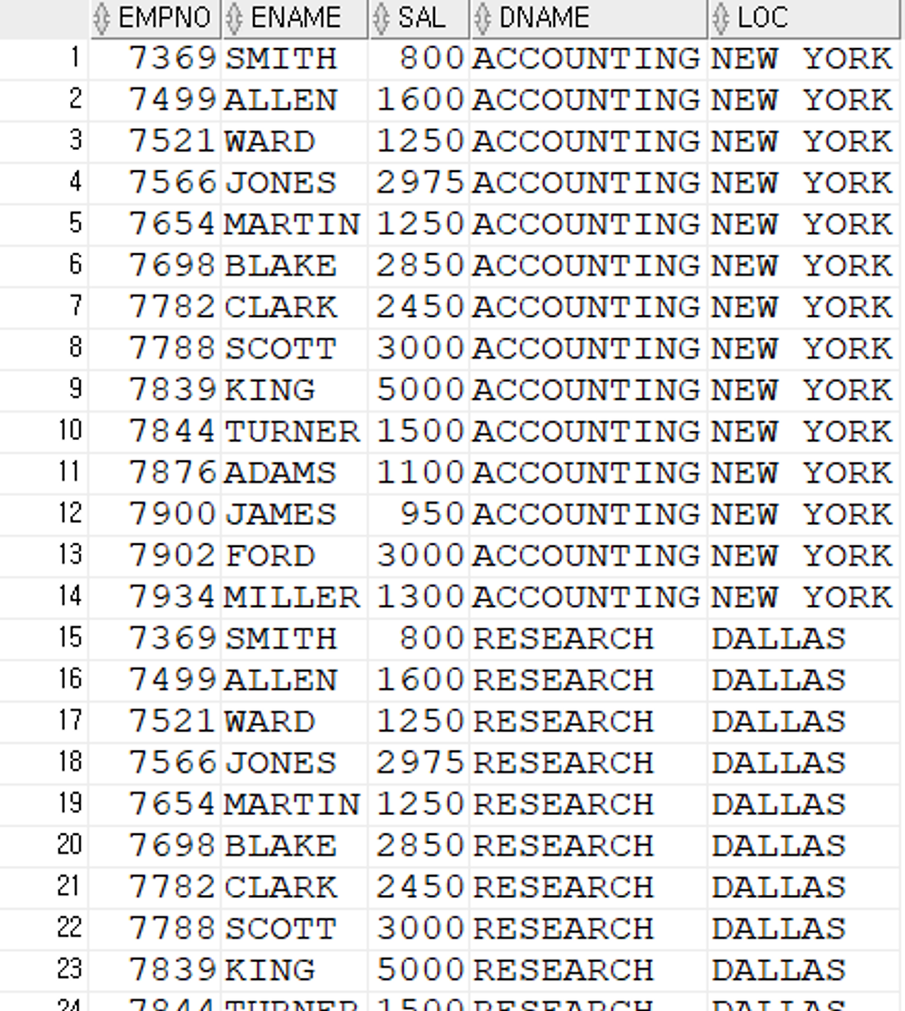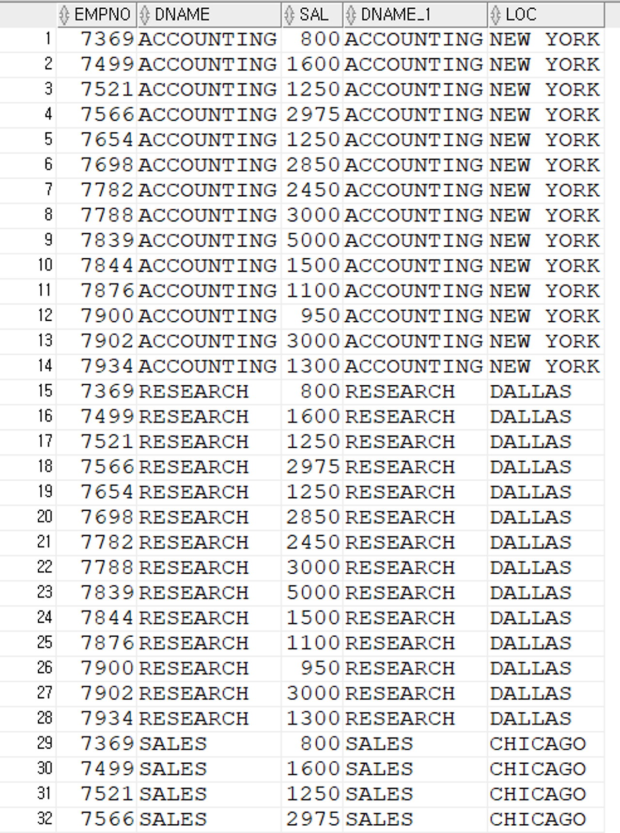 SELECT EMPNO,DNAME,SAL,DNAME,LOC FROM EMP,DEPT;