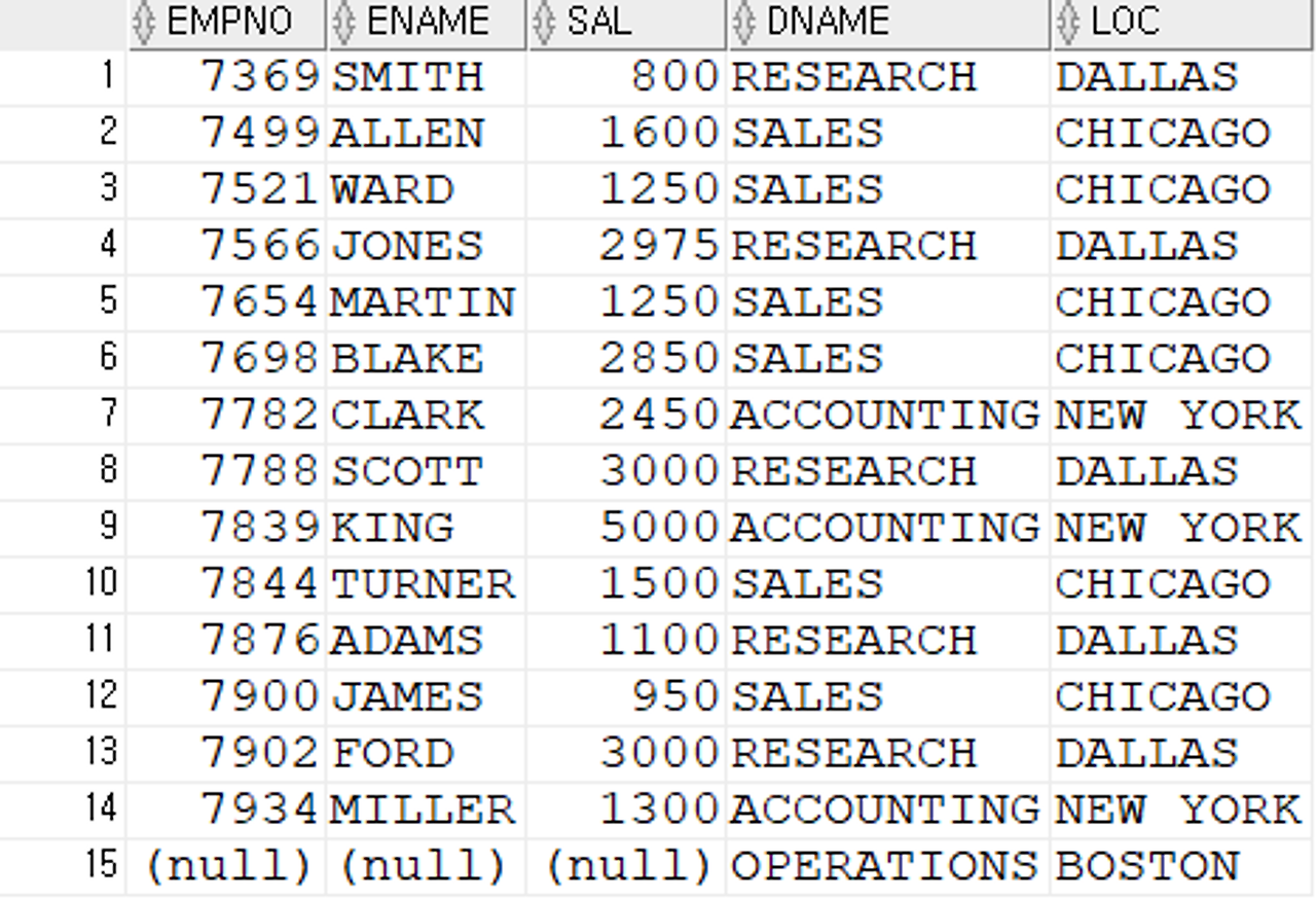 SELECT EMPNO, ENAME, SAL, DNAME, LOC FROM EMP FULL OUTER JOIN DEPT ON EMP.DEPTNO=DEPT.DEPTNO;