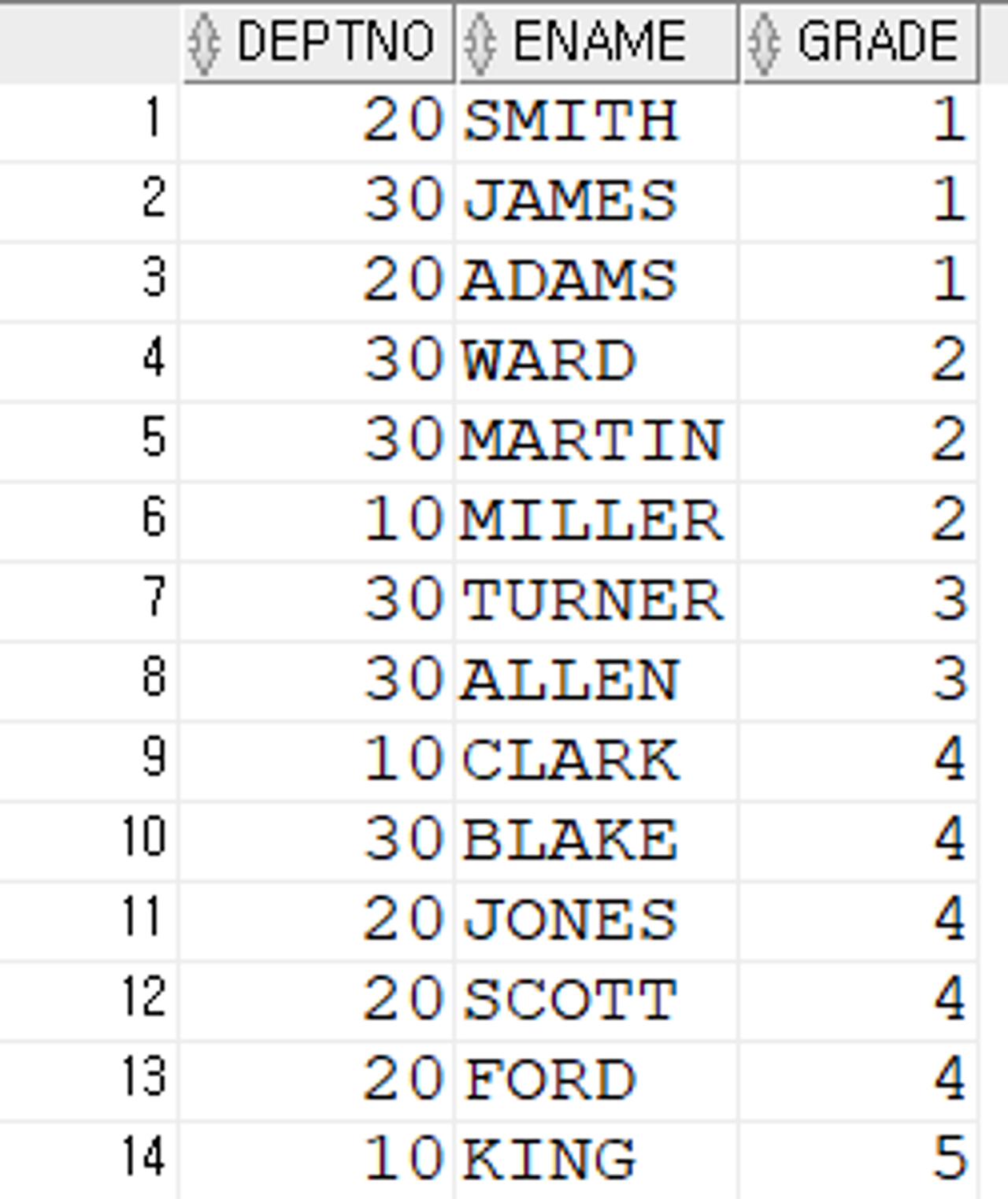 SELECT DEPTNO, ENAME, GRADE FROM EMP, SALGRADE WHERE SAL BETWEEN LOSAL AND HISAL;