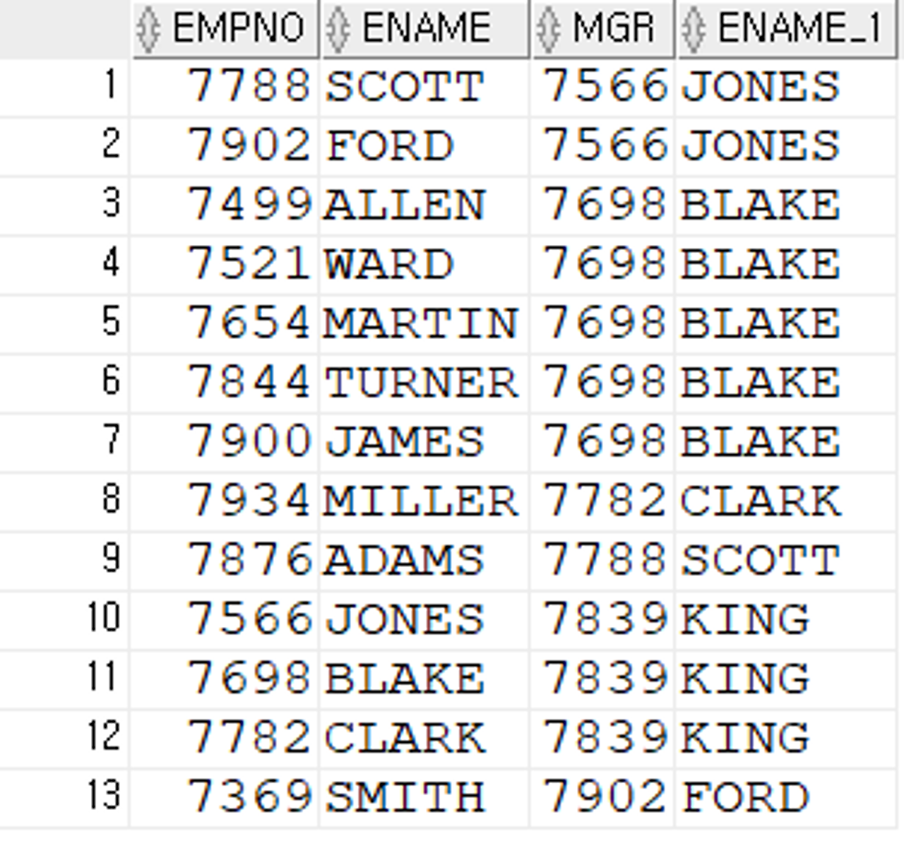 FROM EMP WORKER INNER JOIN EMP MANAGER ON WORKER.MGR = MANAGER.EMPNO;