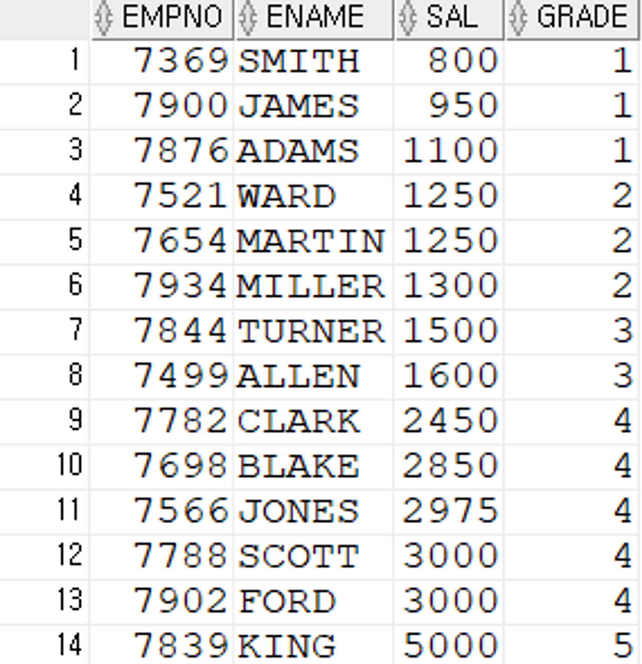 SELECT EMPNO, ENAME, SAL, GRADE FROM EMP INNER JOIN SALGRADE ON SAL BETWEEN LOSAL AND HISAL --결합조건