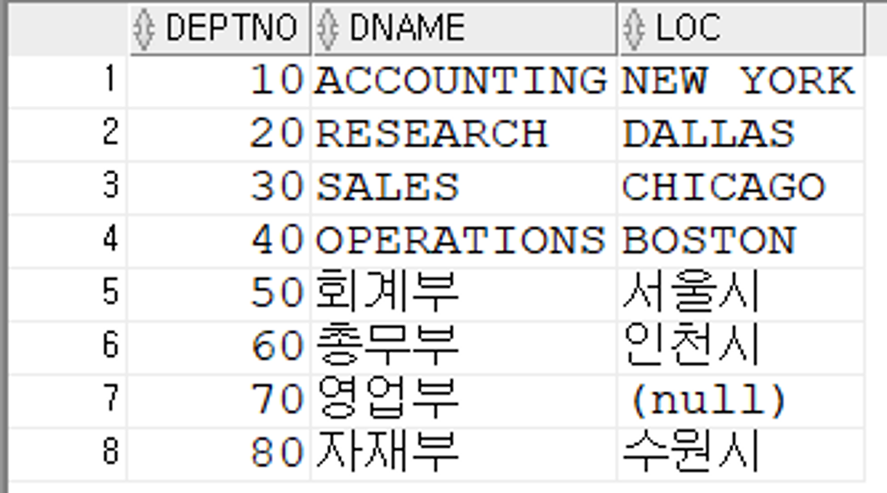 INSERT INTO DEPT(LOC,DEPTNO,DNAME) VALUES('수원시',80,'자재부');