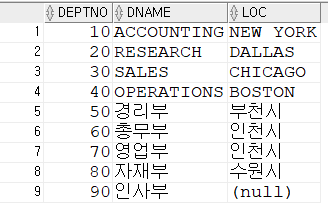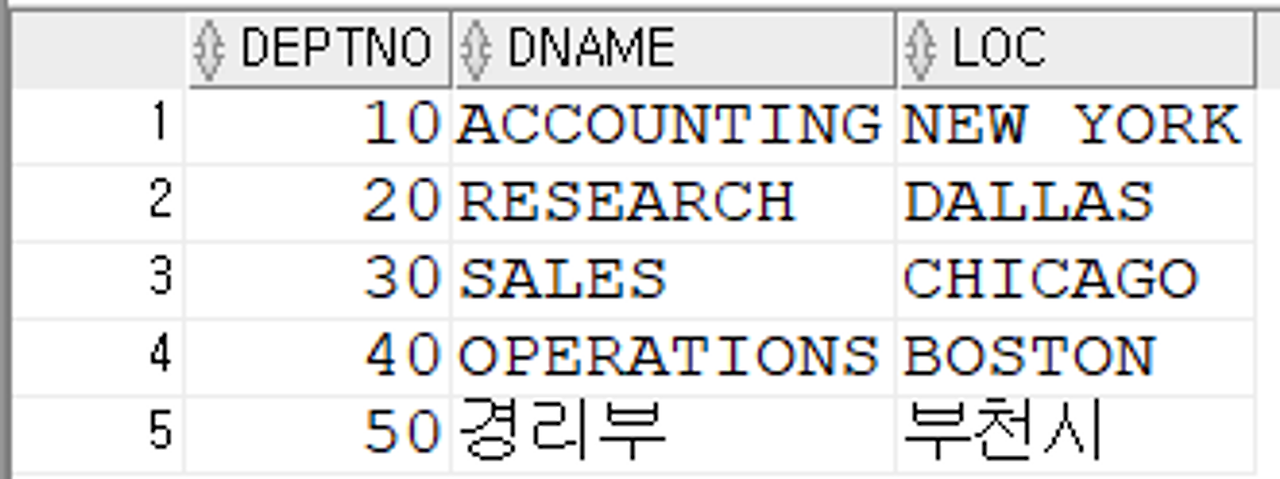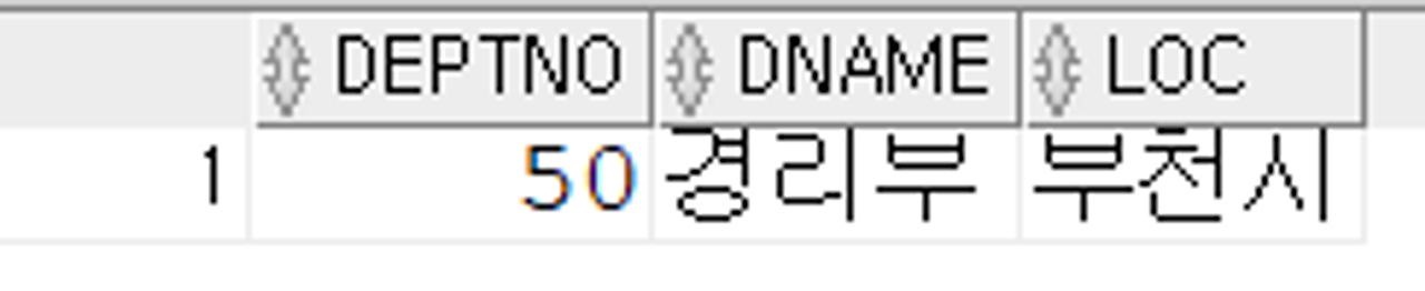 UPDATE DEPT SET DNAME='경리부', LOC='부천시' WHERE DEPTNO=50;