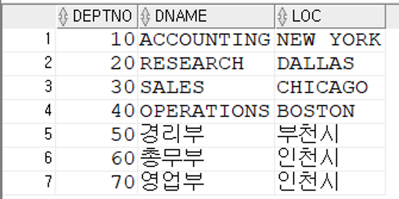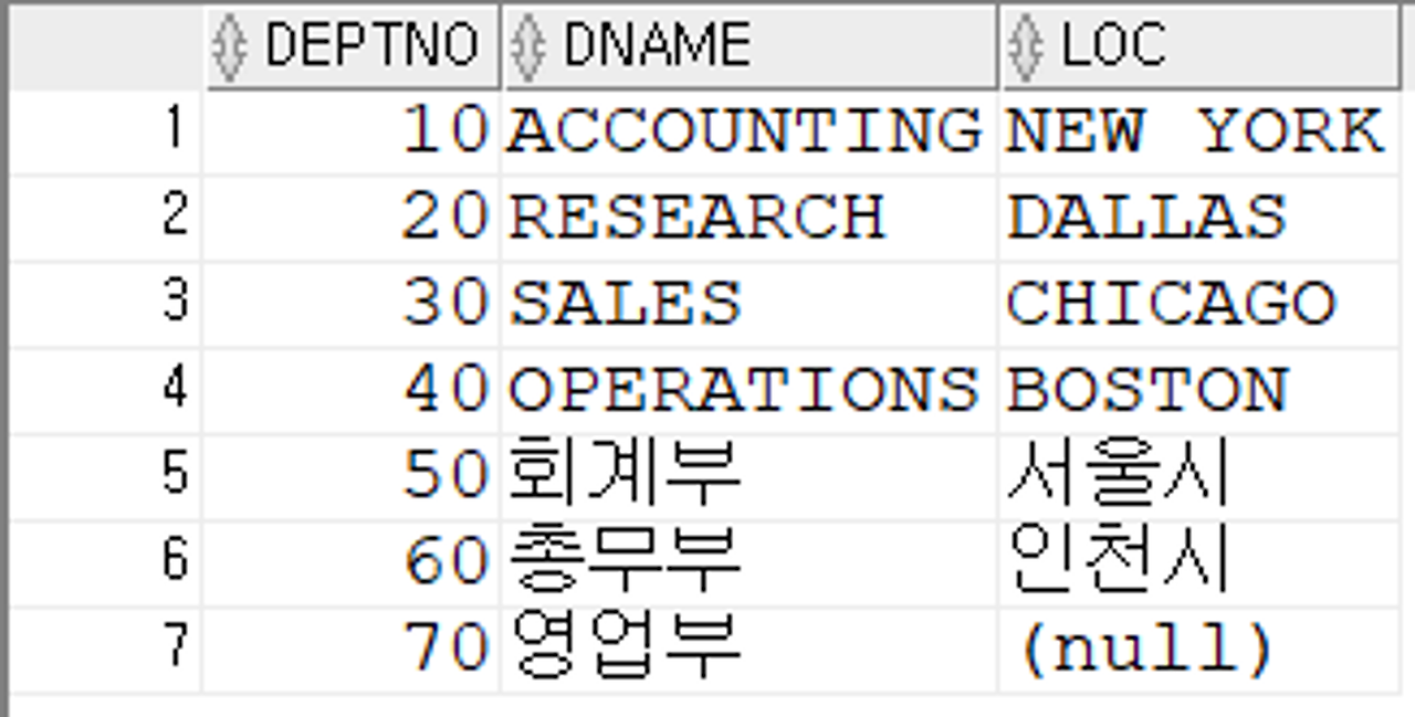 INSERT INTO DEPT VALUES('60', '총무부', '인천시'); --OK이니 주의하자!