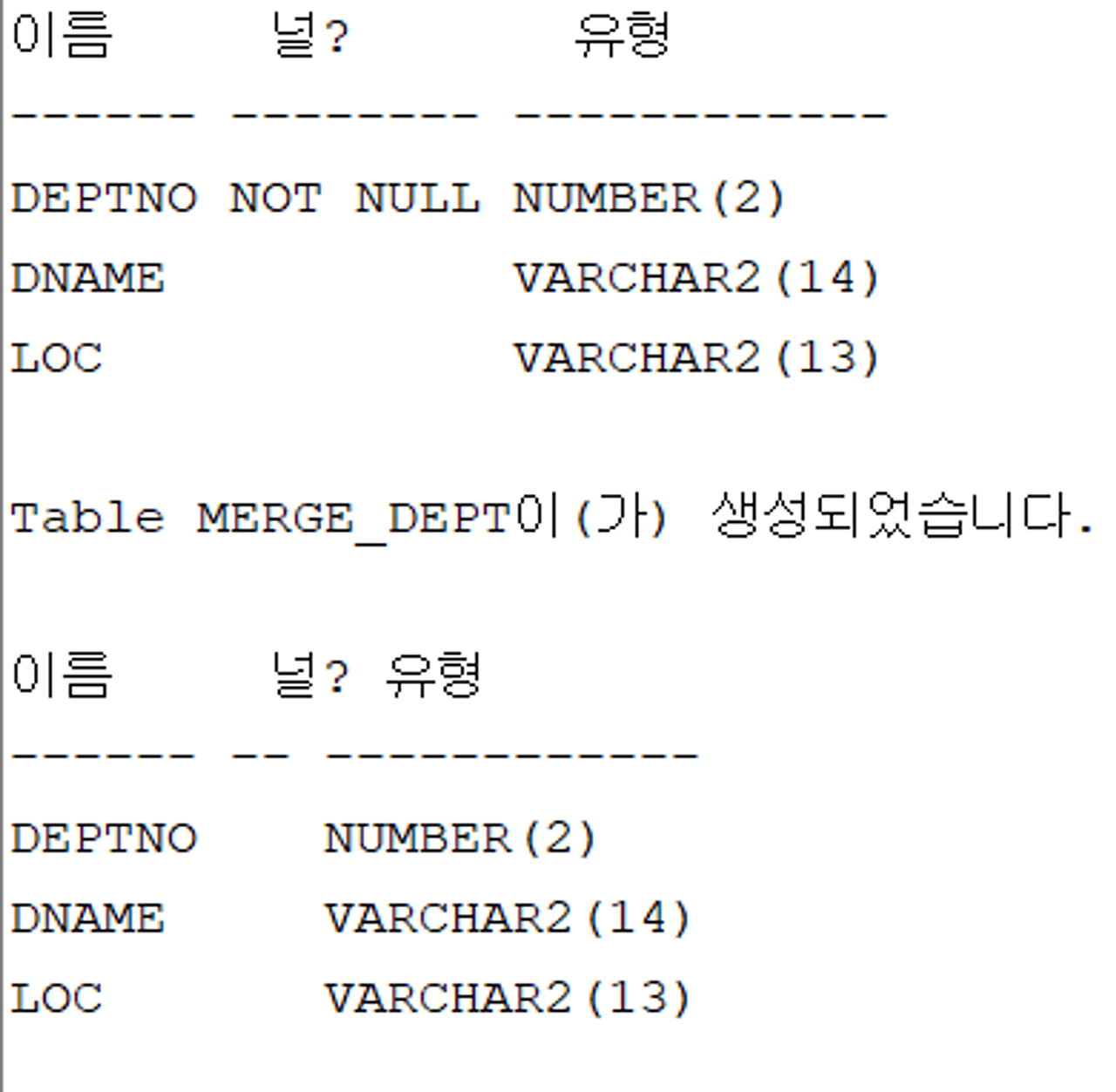 --DEPT테이블과 동일한 속성의 MERGE_DEPT 테이블 생성