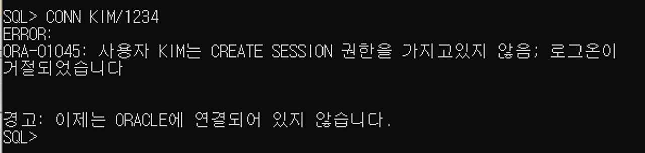 //ORA-01045: 사용자 KIM는 CREATE SESSION 권한을 가지고있지 않음; 로그온이 거절되었습니다.