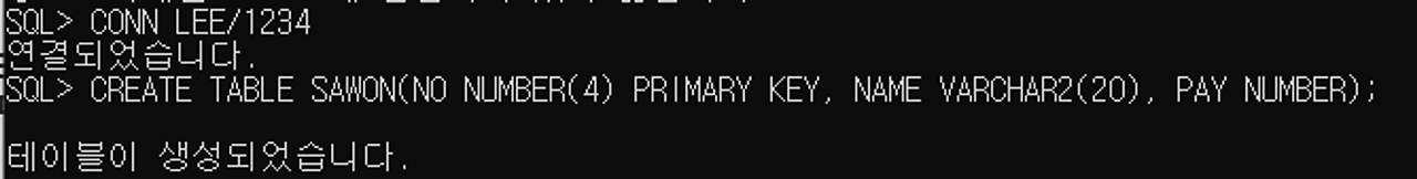 SQL> CREATE TABLE SAWON(NO NUMBER(4) PRIMARY KEY, NAME VARCHAR2(20), PAY NUMBER);