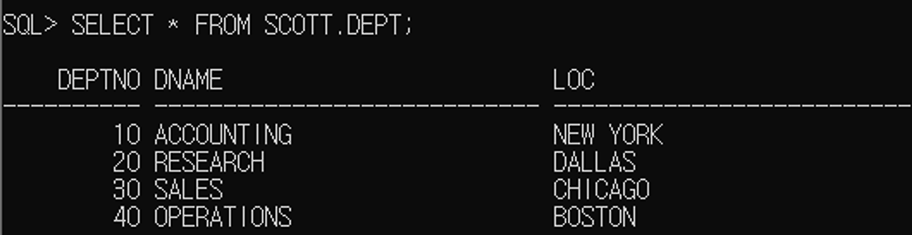 SQL> SELECT * FROM SCOTT.DEPT;